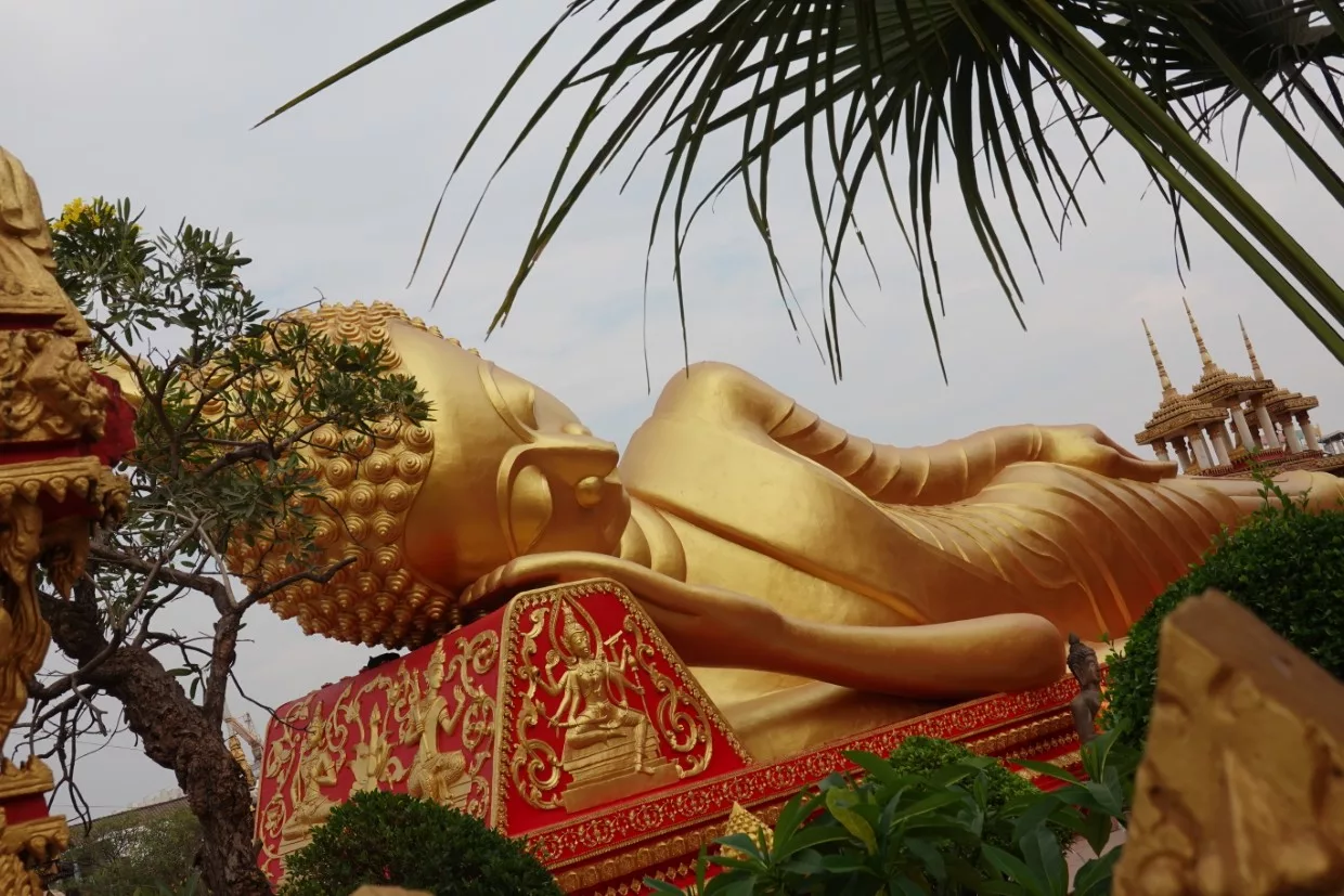 Nach vielen Fotos von Buddas, Ornamenten und Dächern verließen wir diesen Bereich und kamen an Klostermauern vorbei. Dahinter verbarg sich nicht nur das Kloster, sondern auch der Friedhof, der heute geschlossen sei. Den riesigen liegenden Budda konnte ich über den Zaun fotografieren.