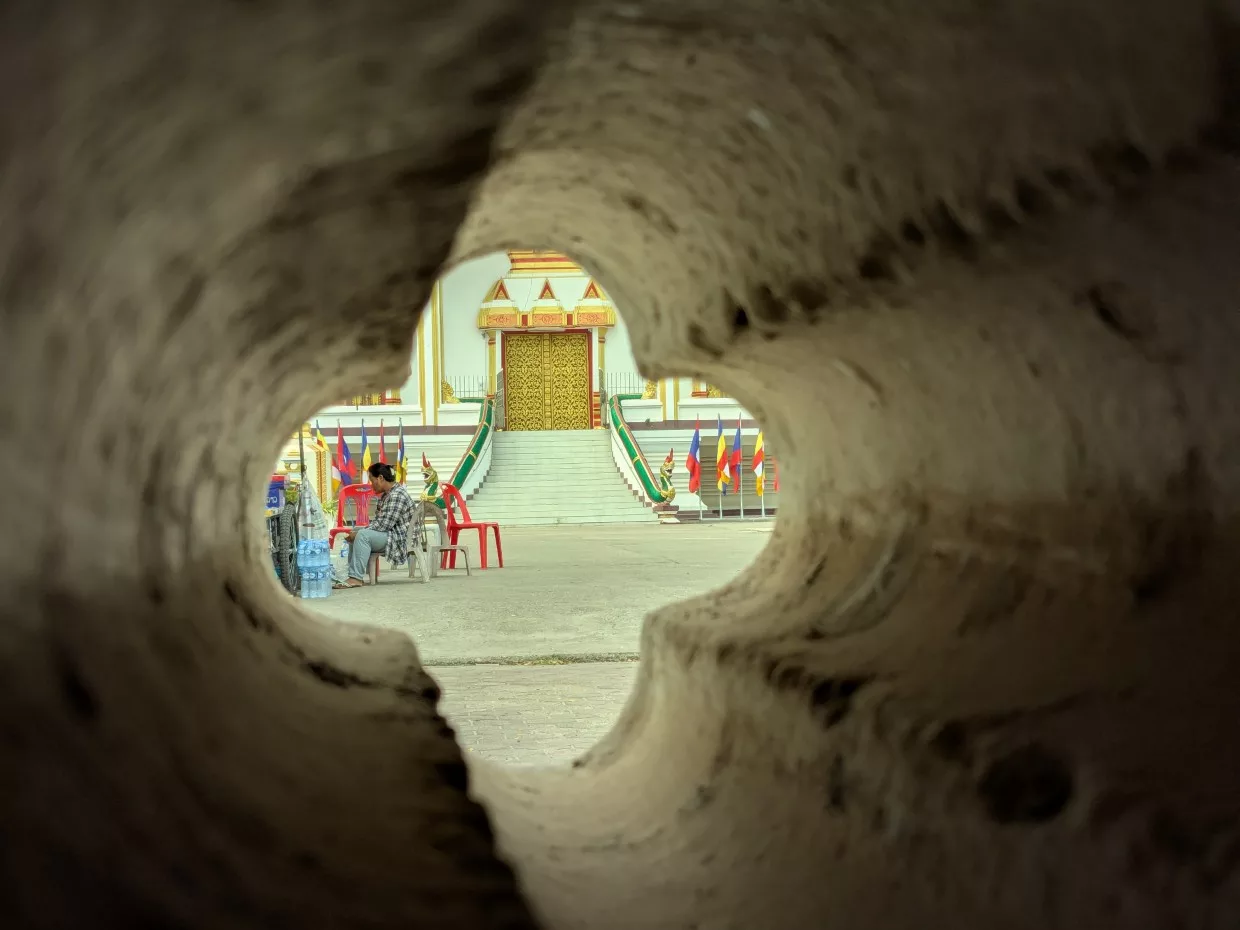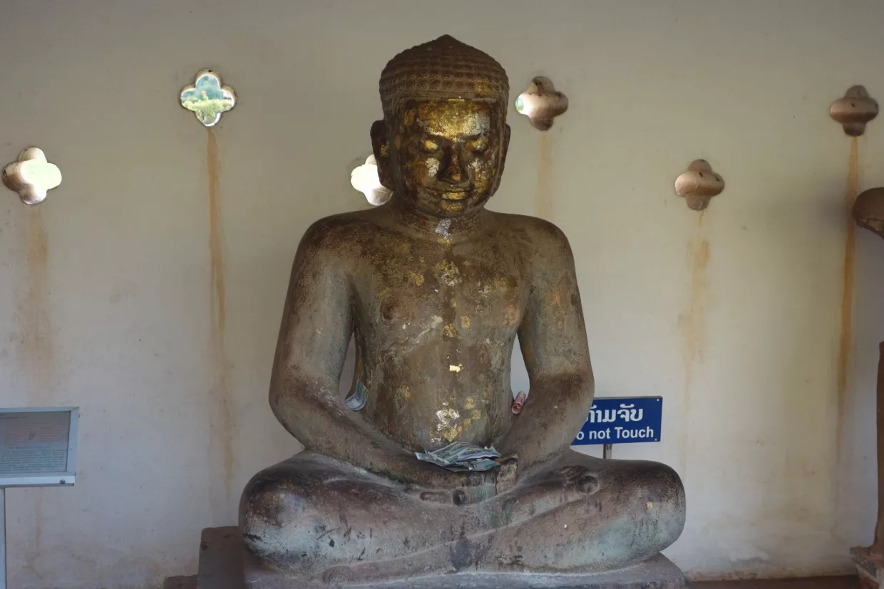 Außen herum verläuft so etwas wie ein Kreuzgang in unseren Klöstern. Unter dem schattigen Dach läuft man im Uhrzeigersinn (das soll Glück bringen) an vielen Buddastatuen vorbei.