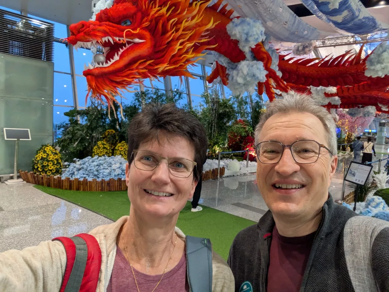 Gestern, als Tom versuchte, uns schon am Vortag einzuchecken, sahen wir, dass zwei Frauen aus unserer Reisegruppe mit uns im selben Flieger sitzen werden. So hielten wir schon dauernd Ausschau und versuchten sie zu finden. Als wir dann im Flieger unsere Plätze einnahmen, sprach uns jemand aus der Reihe vor uns an und fragte, ob wir zu Studiosus gehören. So lernten wir schon in Frankfurt die ersten Mitstreiter der Indochina-Reise kennen.