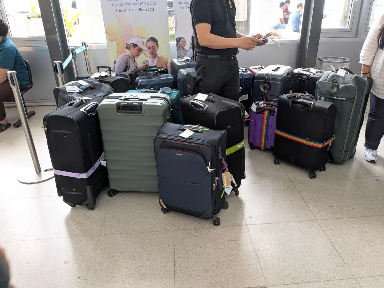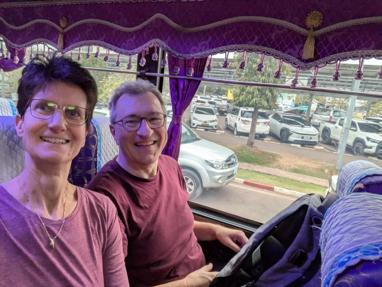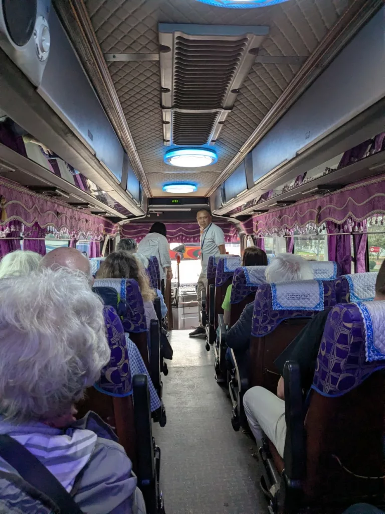 Studiosus hat für uns schon alles organisiert und so wurden wir vom Busfahrer und einem weiteren Reisebegleiter (Laote, der in Ostberlin einige Zeit verbracht hatte) in Empfang genommen. Die Koffer wurden uns abgenommen und separat ins Hotel gebracht, während wir per Bus zu unserem Übernachtungsort gebracht wurden. Der Bus besticht mit asiatischem Flair.