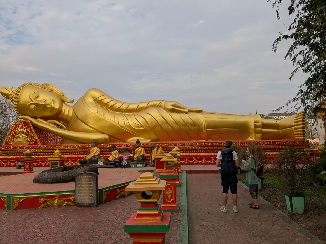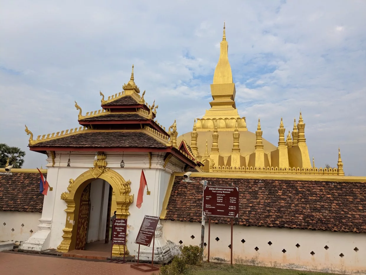 Nach einer Dusche und kurzem Füße hochlegen, gings schon gleich mit dem Bus weiter nach Pha That Luang (Große Stupa) https://en.wikipedia.org/wiki/Pha_That_Luang . Eine Stupa ist so was wie bei uns ein Reliquienschrein und dieser hier steht mitten in der City, ist riesengroß, und geht zurück bis in des 3. Jahrhundert n. Chr. Die „vergoldeten“ Dächer glänzten in der Abendsonne, wobei nur die Spitze mit echtem Gold bedeckt ist, der Rest ist nur Goldfarben gestrichen.