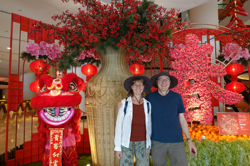 Der Flug zog sich in die Länge, verlief aber bis auf ein paar Turbulenzen ruhig. Nach guten 11 Stunden Flug konnten wir heil in Singapur landen. Hier war es schon ein Tag weiter (31.1.) morgens um kurz vor 7.00 Uhr. Auf Grund des Corona-Virus mussten wir alle durch einen Gang, der mit Wärmebildkameras überwacht wurde. Die Passkontrolle war schnell erledigt und unsere Koffer drehten schon ihre Runde als wir am Gepäckband ankamen. Im Hotel kamen wir so früh an, dass es noch kein Zimmer für uns gab. Unsere sieben Sachen durften wir aber am Empfang lassen und am Pool konnten wir uns einen Kaffee aus dem Automaten brühen lassen. Im Laufe der Zeit merkte ich, was schwül-warm wirklich heißt. Wir kamen ins Schwitzen ohne etwas getan zu haben.