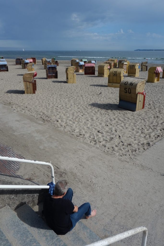 Tom wollte zum Abschied vom Meer wenigstens einmal den Sand unter den Füßen spüren. Hier in diesem Ort hatten wir übernachtet und die Kurtaxe bezahlt und durften deshalb auch den Strand betreten.