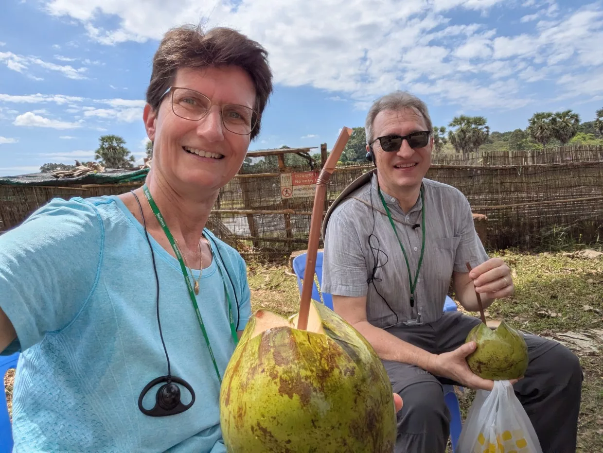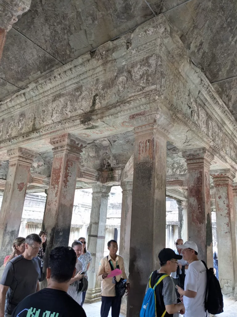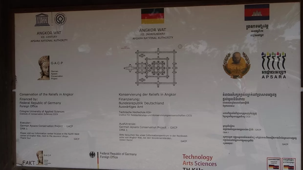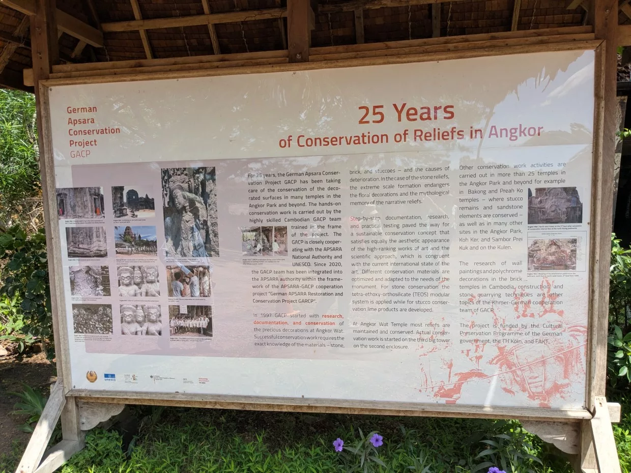 Nach einer kleinen Pause im Schatten mit einem Kokosnussdrink wollte unsere Reiseleiterin uns noch etwas besonderes zeigen. Seit 25 Jahren hilft Deutschland bei der Konservierung der Reliefs. Mit neuer Technologie werden die Apsaras vor dem Zerfall geschützt. Leider gibt es Stellen, an denen man nicht mehr helfen konnte. Da waren schon zu große Schäden, aber an anderen Plätzen konnte man die Schönheit retten.