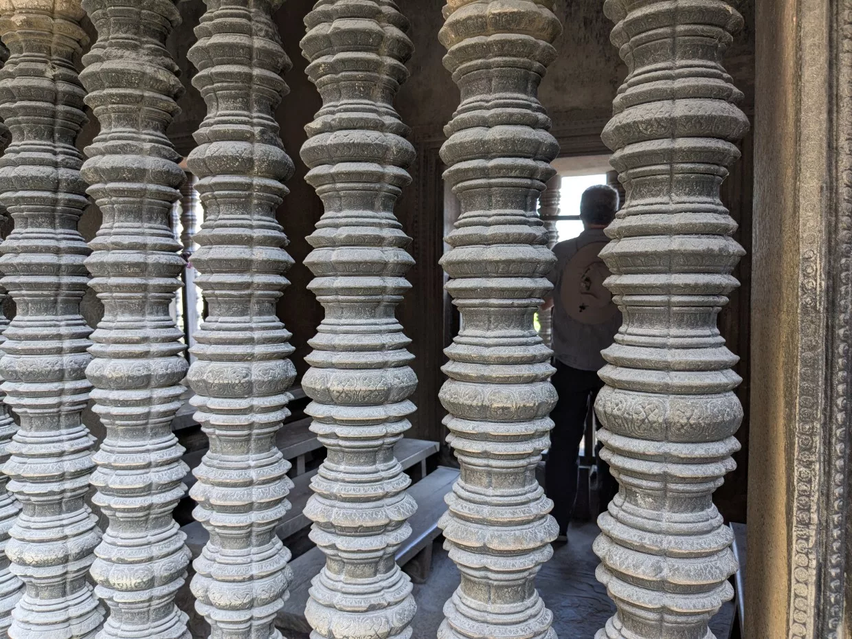 Die Aussicht auf die Tempelanlage unter uns und die vielen verschiedenen Nischen, Ecken und Winkel entschädigte uns für die Mühsal. Die „gedrechselten“ Säulen in den Fenstern, die die Sonne etwas abhalten und für weniger Licht sorgen, sind nicht aus Holz, sondern aus Stein gearbeitet. Was müssen das für Handwerker gewesen sein, die so etwas erschaffen haben.