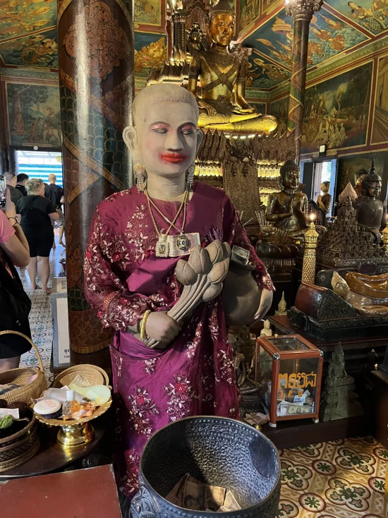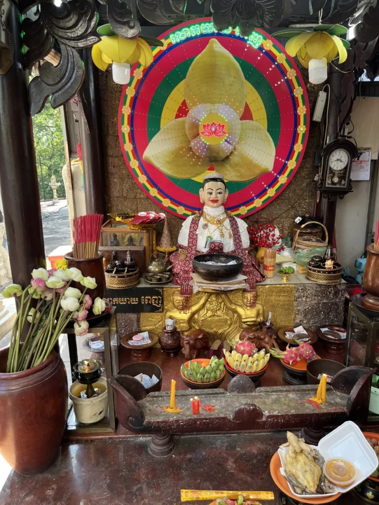 Ganz oben auf dem Berg steht der Tempel von Mrs. Penh. Sie wird besonders von Frauen verehrt und da man sie so gern hat schminkt man sie, schenkt ihr Schmuck und kleidet sie ein. Alles, was Frauen gerne machen und gerne geschenkt bekommen.