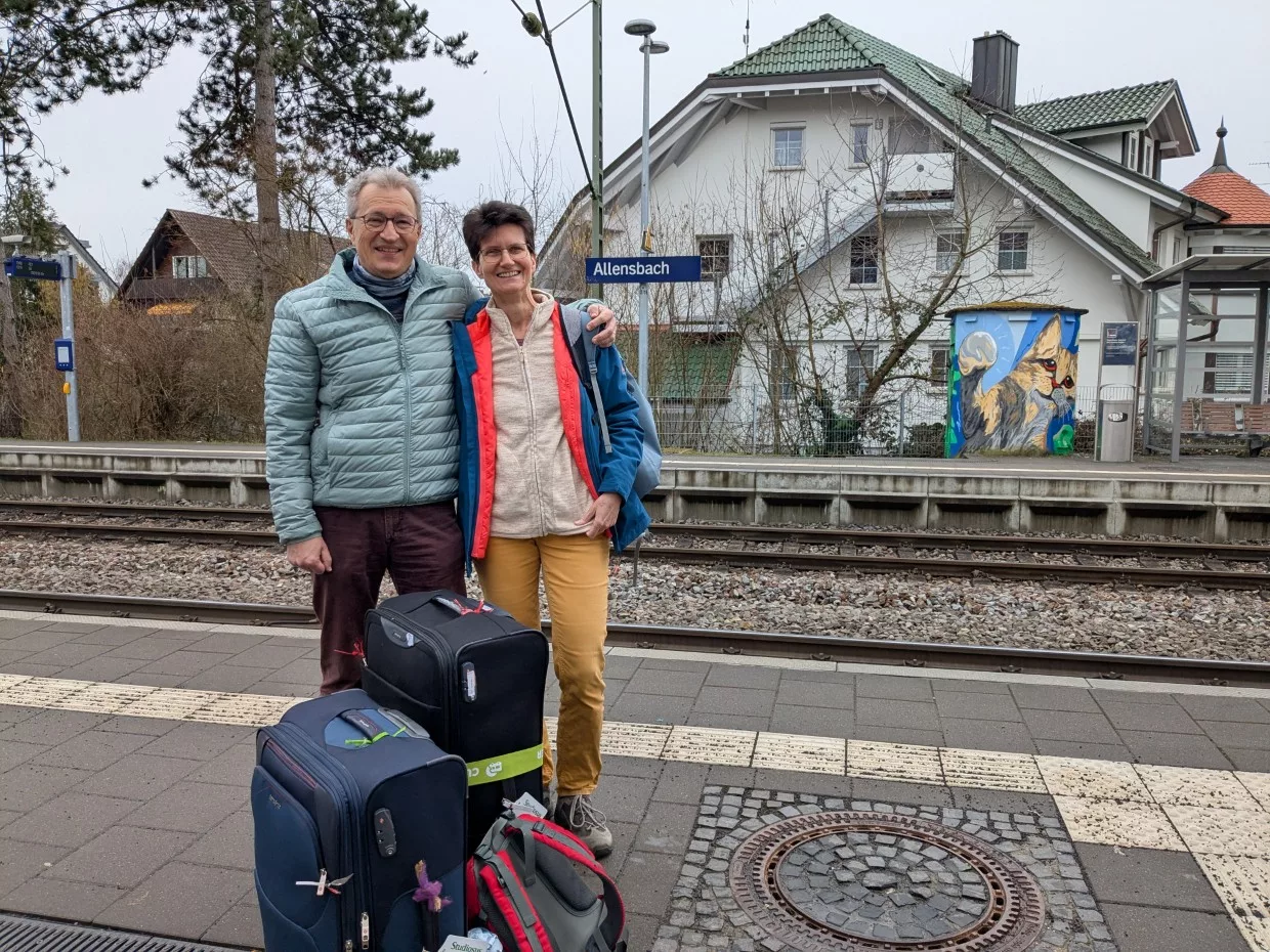 Nachdem alles eingepackt, die Tiere und Pflanzen versorgt waren, wurde noch schnell ein typisches süddeutsches Essen auf den Tisch gestellt, bevor es nur noch scharfes (Koriander verseuchtes) Essen gibt. Es gab geschmälzte Maultaschen mit Zwiebeln und Ei. Nachdem die Küche aufgeräumt war, fuhr uns unser Sohn nach Allensbach an den Bahnhof und schon geht die Reise los.