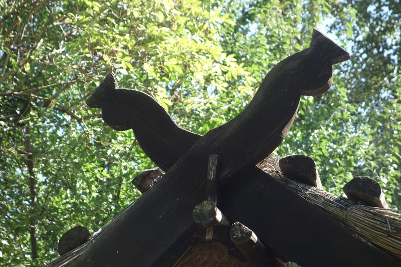 Die Schlangen sollten die Häuser beschützen. Wenn ein Hochwasser kam, flüchteten die Schlangen auf höhere, trockenere Stellen in der Landschaft. Genau dort baute man dann die Häuser. Die Krönchen auf den Köpfen der Schlangendarstellung kommt daher, dass es meistens Ringelnattern sind, die hier leben, und diese am Kopf gelbe Stellen haben (Kronen).