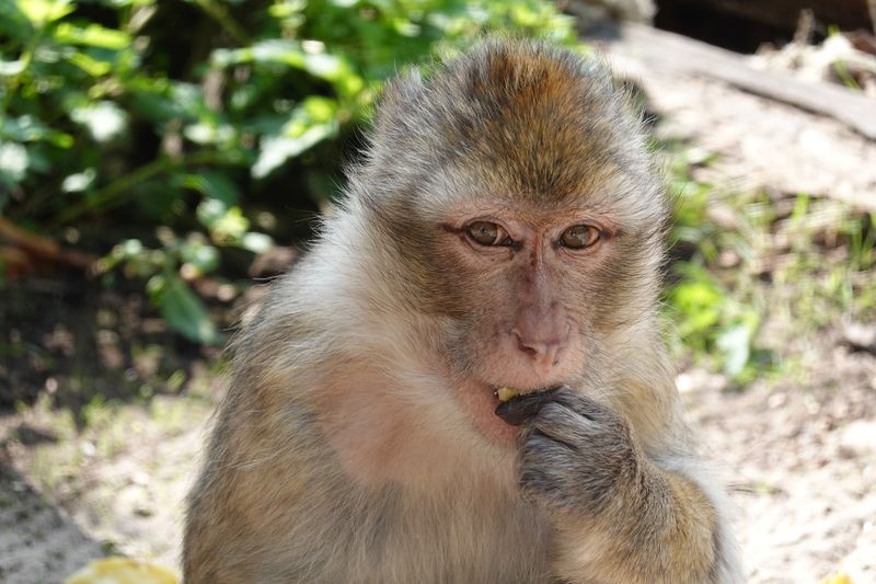 Bei den Berberaffen wurde gerade gefüttert. Hier durften wir in das Gehege rein gehen. Wir konnten insgesamt 14 Tiere (zwei Junge) zählen. Sie saßen in einem abgestorbenen Baum und als die ersten Tiere sich runtertrauten konnte Tom ein paar wirklich schöne Aufnahmen machen.