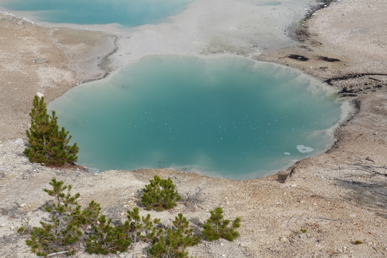 Bei einem kleinen Spaziergang am See entlang stellten wir fest, dass es sehr wenige Wasservögel und noch weniger Boote auf dem Wasser gibt. Für heute sind wir schon so viele Kilometer gegangen und zu beobachten gibt es wohl auch nicht so viel, deshalb zog es uns dann noch zum nahen West Thumb Geyser Basin. Und was soll ich sagen, hier gibt es wieder hydrothermische Quellen.