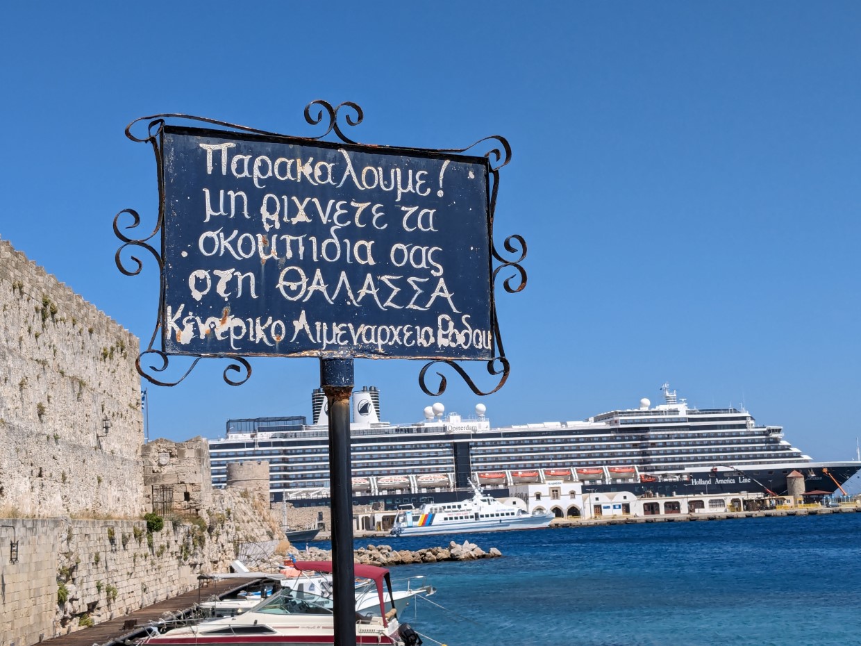 Pünktlich um 8.30 Uhr versammelten sich die Teilnehmer mit den am Vorabend ausgeteilten Kopfhörern im Foyer und warteten gespannt, was unser Guide Nicos für uns vorbereitet hat. Als die Gruppe vollzählig war, spazierten wir vom Hotel zum Hafen, wo der Bus für uns parat stehen soll. Unten im Hafen wurden wir über den Koloss von Rhodos aufgeklärt.
