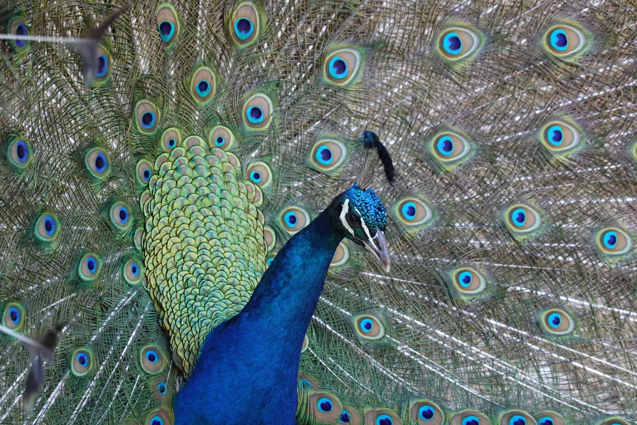 Auf dem gesamten Areal sind sehr viele Pfaue anzutreffen. Jetzt im Frühling versuchen die Männchen mit ihrem Geschrei und dem Aufstellen der Schwanzfedern den Weibchen zu imponieren.