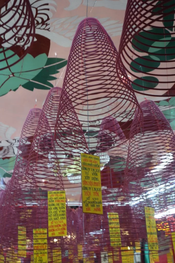 Hier lernten wir, dass es nicht nur Räucherstäbchen für ein Gebet über 20 oder 40 Minuten gibt, sondern auch für mehrere Tage. Diese hängen spiralförmig von der Dicke und es rieselt immer wieder Asche von oben auf die Besucher nierder.