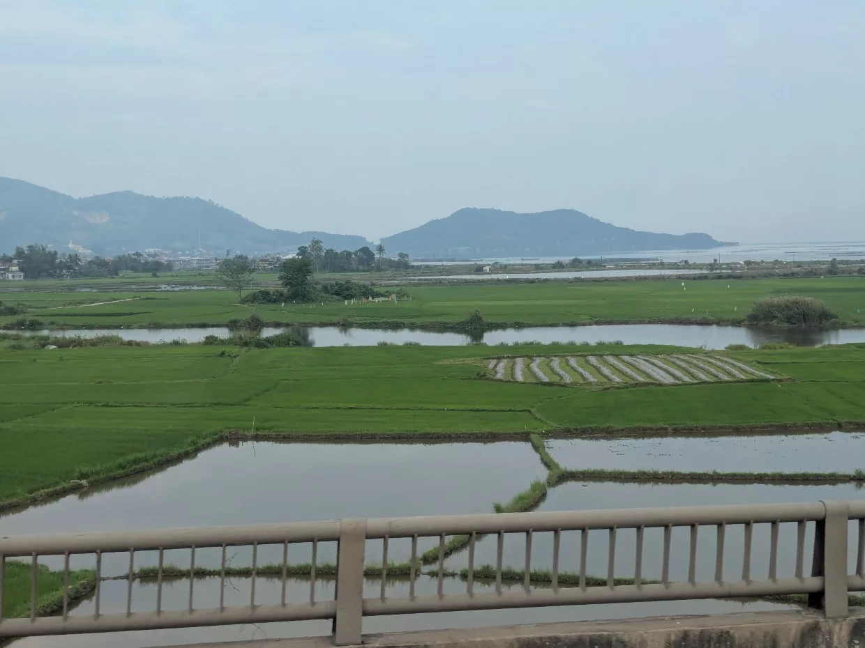Zuerst fuhren wir durch flaches Land in dem Reis angebaut wird. Die Pflanzen sind erst wenige Wochen alt und sind schon saftig grün uns stehen in Reihen im Wasser auf den Feldern.