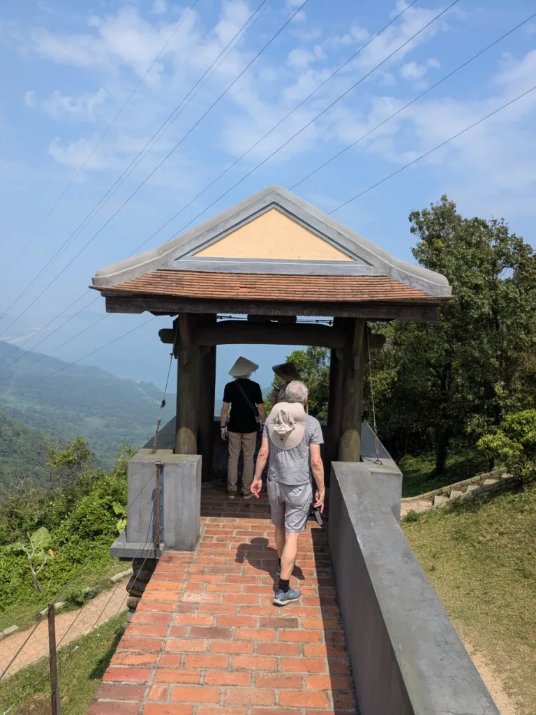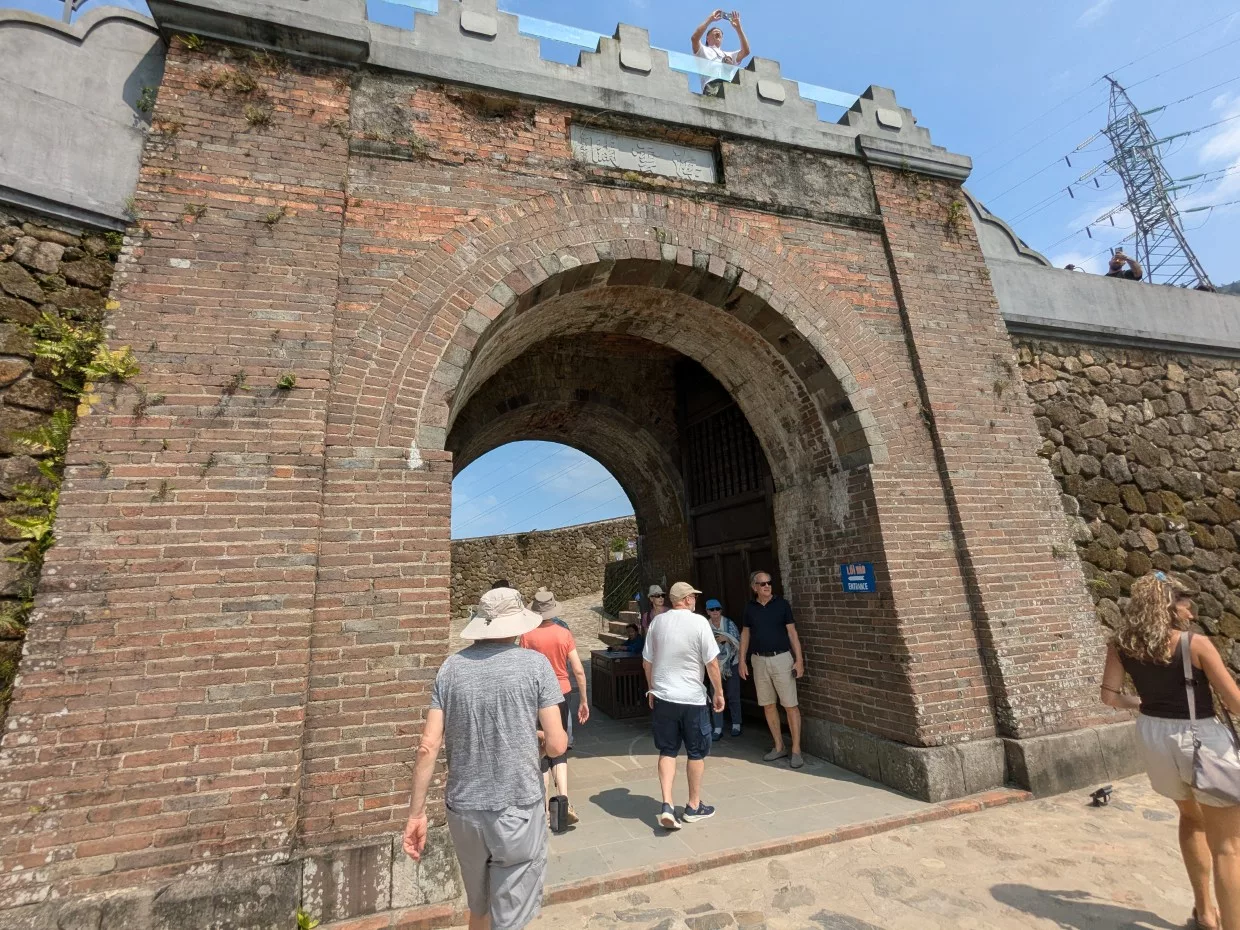 Oben auf dem Pass machten wir einen kleinen Stopp und stiegen aus dem Bus aus, um die Sicht zu bewundern. Nach der Zeit im klimatisierten Bus kam uns die Hitze und die Sonne noch intensiver vor und so kamen wir gleich bei den ersten Stufen zu den Plattformen ins Schwitzen. Heute ist die Sicht nicht so gut, da Wolken sich versammelt haben und es diesig ist. Für heute Abend ist Regen vorhergesagt. Der Pass war schon immer eine Schlüsselstelle, um die Verbindung in den Norden oder Süden zu kontrollieren und zu bewachen, deshalb stehen hier Mauern und auch ein Tor.