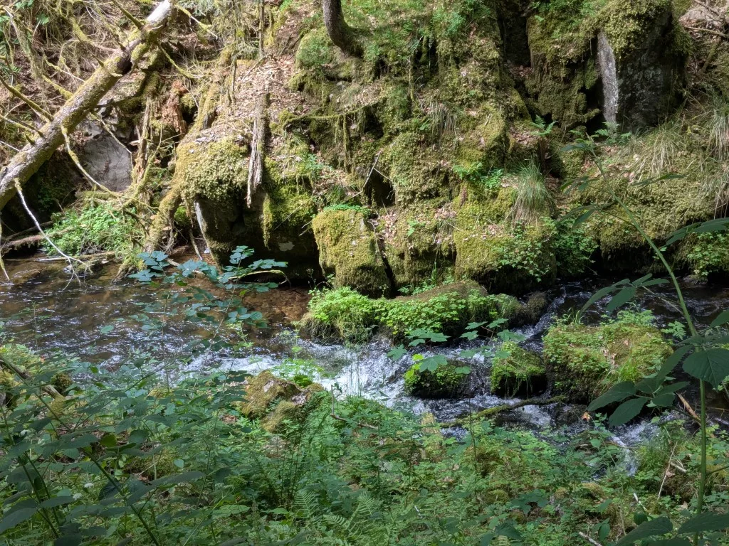 Vom Stadtgarten führt der Rundweg durch den Stadtgraben immer bergauf an Sandsteinfelsen vorbei, in denen Uhus brüten,