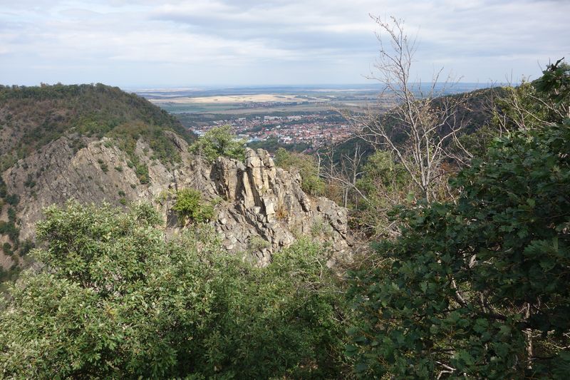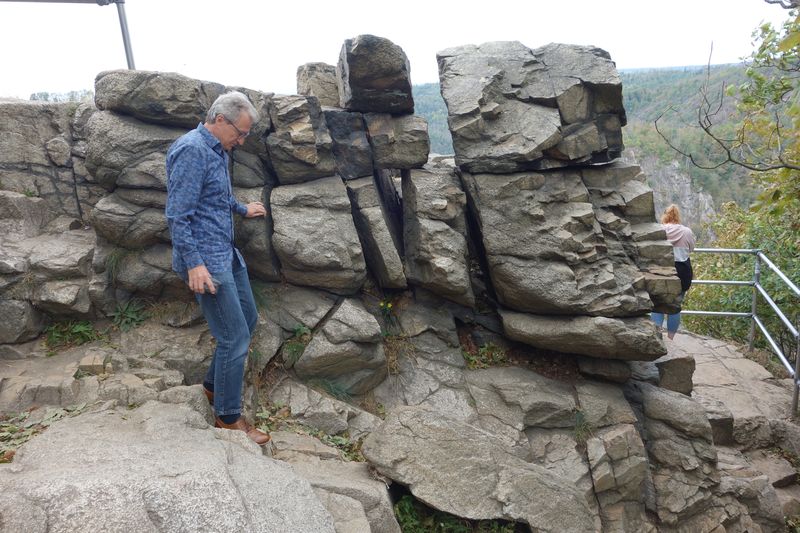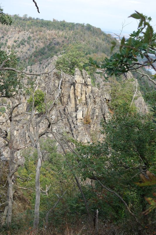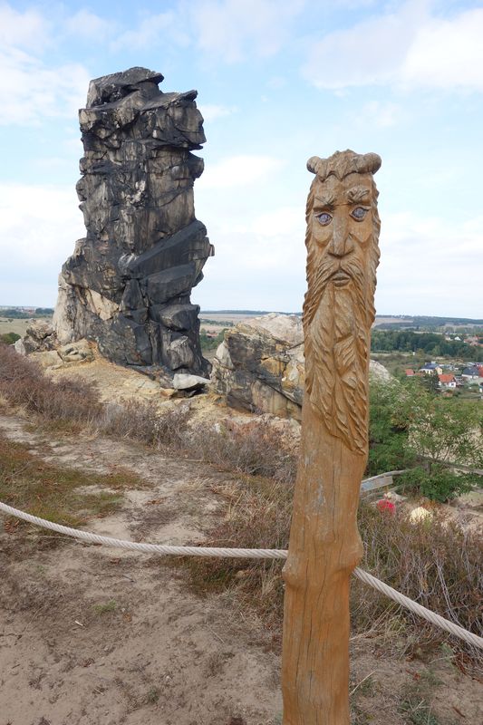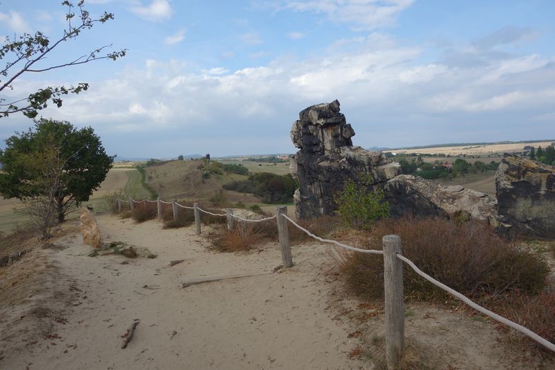 Nach einer Thüringer Rostbratwurst und Fassbrause machten wir uns auf den Weg zu einem anderen Aussichtspunkte. Schon beeindruckend, wie sich die Felsen zu einer Bergkette auftürmen, wenn man zuvor über eine flache Ebene herkam.
