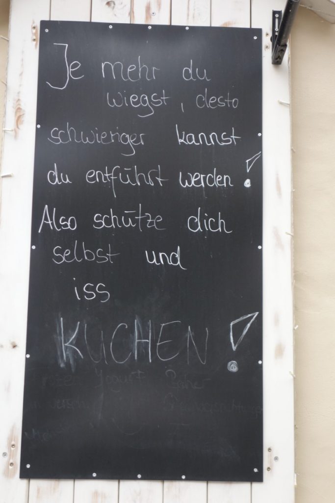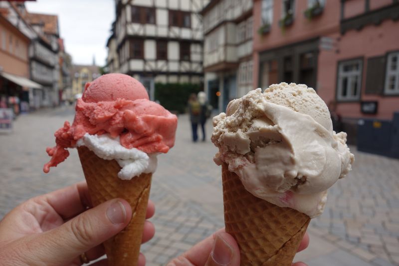 In einer Eisdiele haben wir neue Eissorten entdeckt. Tom wollte aber nicht diese Geschmacksrichtungen wie Basilikum oder Leberwurst testen. Er wählte Birne und Erdbeere. Ich war mutiger und nahm Lakritz und Marshmallow.