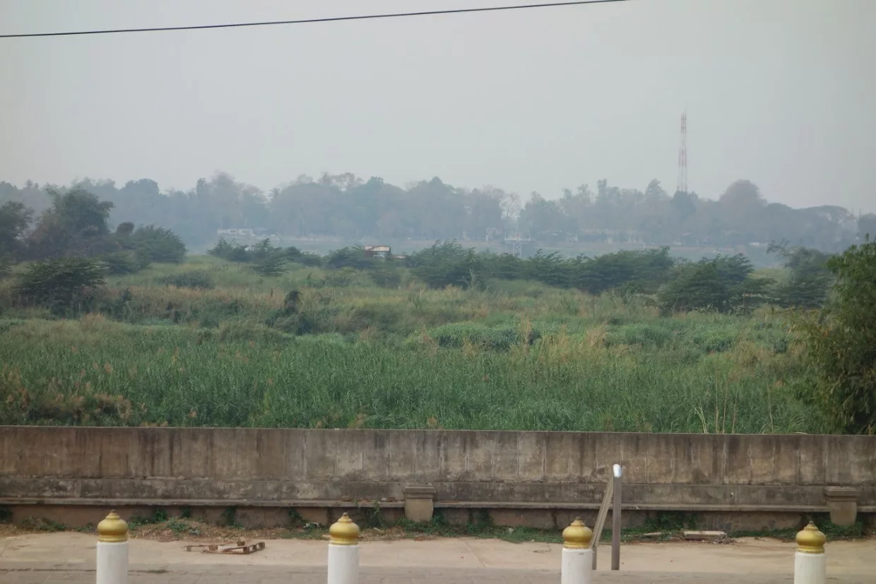 Vom Podest der Statue aus konnten wir über den Mekong (nicht zu sehen) nach Thailand schauen. Der Fluss dient auf langer Strecke als Grenze zu Myanmar und Thailand.
