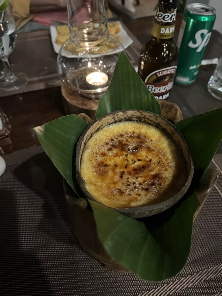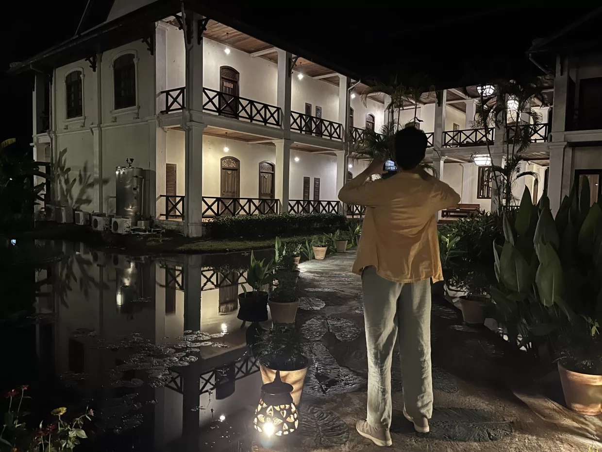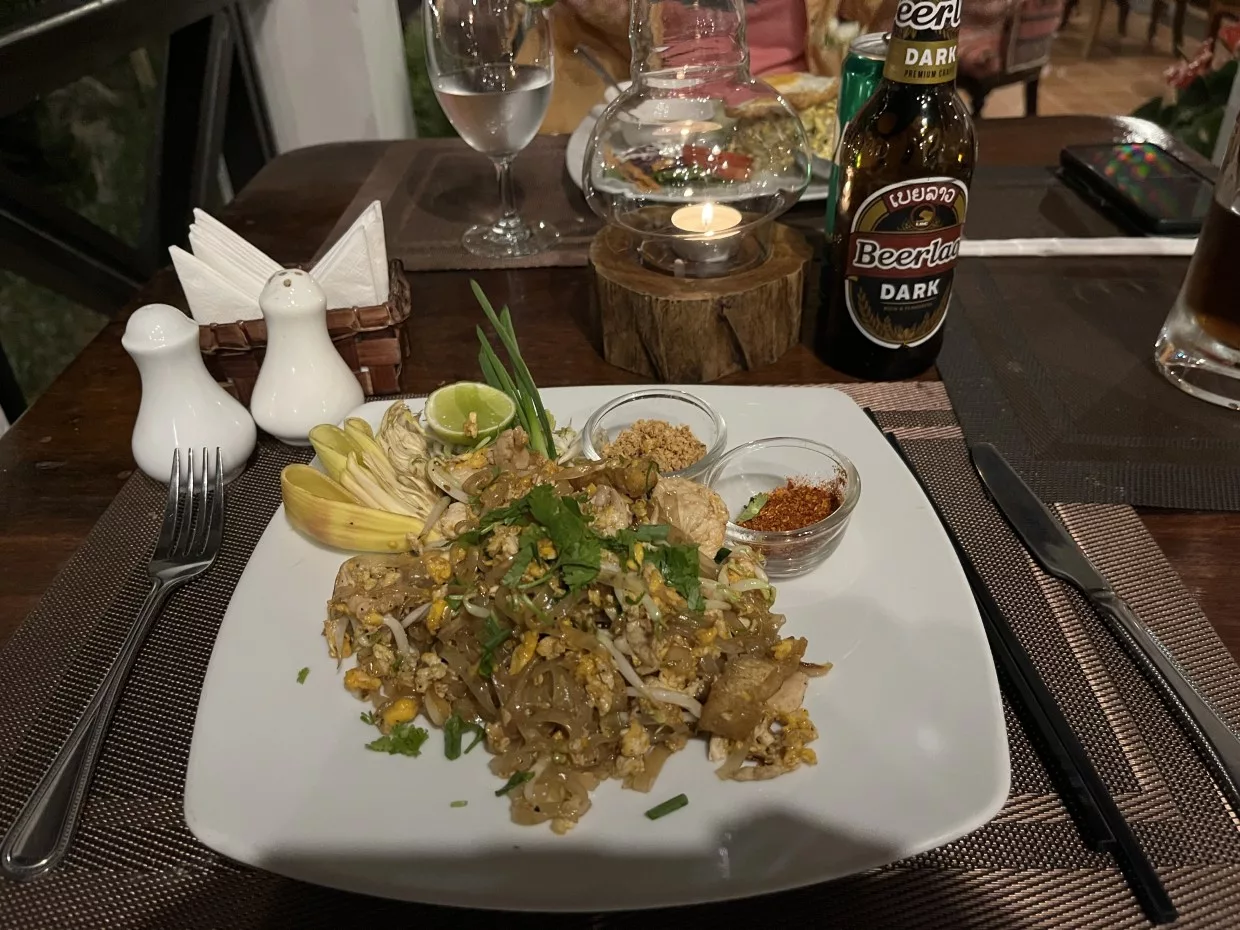 Den restlichen Tag und Abend lassen wir im Hotel mit seiner wunderschönen Parkanlage am Rand von Luang Prabang mit Essen (meines war ohne Koriander) auf der Terrasse ausklingen.