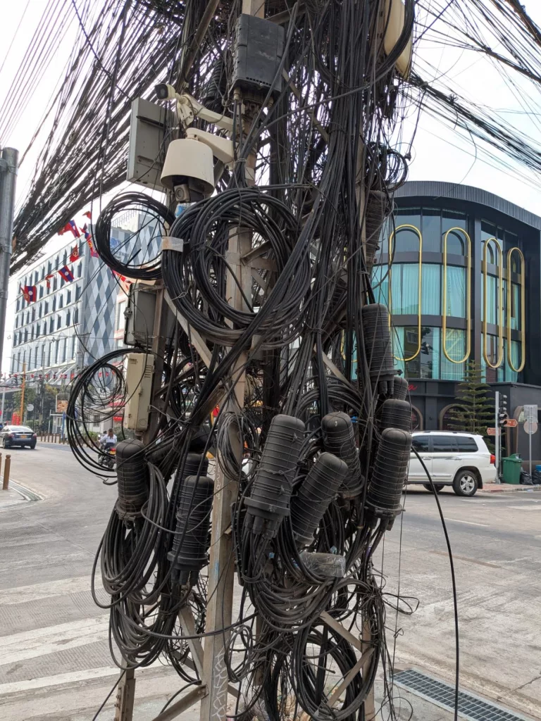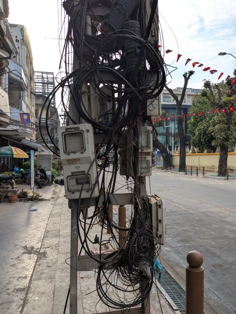 Nach einem leckeren Frühstück mit French Toast und frischen Früchten begaben auch wir uns zum Bus, kontrollierten ob unsere Koffer davorstanden und stiegen ein. So wurde sichergestellt, dass auch wirklich kein Gepäckstück zurückblieb. Auf dem Weg zum Bus konnte ich diese Bilder von den elektrischen Leitungen machen. Hier möchte ich nicht Elektriker sein.