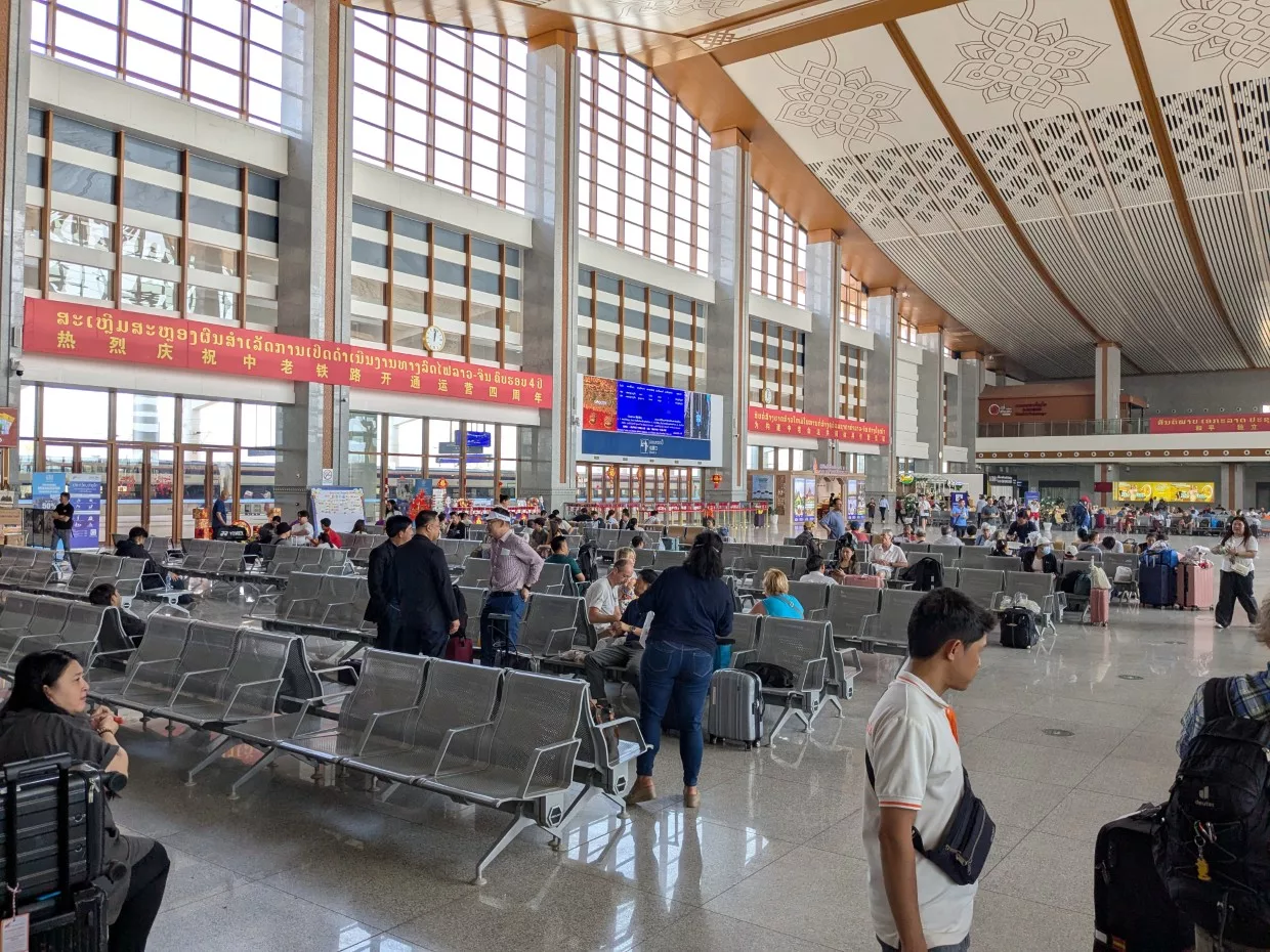 Wir waren bei Zeiten dran und so machten wir eine Vorstellungsrunde im klimatisierten Bus. Unsere Gesellschaft besteht also aus 22 Personen, mehr Frauen als Männer. Drei leben in Wien, eine in Tirol (gebürtig aus Ungarn), eine wohnt in Zürich mit deutschem Pass, der Rest verteilt sich über Baden-Württemberg, Sachsen und Bremen. Laos ist mit seinem Karstgebirge ein sehr unwegsames Land und wurde lange Zeit nicht wirklich erschlossen. Seit Dezember 2021 gibt es eine Bahnstrecke, für einen Schnellzug, die von den Chinesen in kürzester Zeit erbaut wurde. Als wir in Georgien waren, erfuhren wir damals schon, dass die Chinesen diejenigen sind, die für schnellen Straßen-, Tunnel- und Brückenbau sorgen. Auf diese Weise verkürzte sich die Strecke zwischen Vientiane und der chinesischen Grenze von 3 Tagen Autofahrt auf 3 Stunden Zugfahrt. Das Bahnhofsgebäude sieht von innen und außen groß, sauber und modern aus.