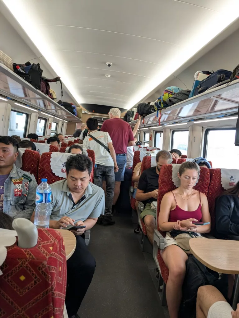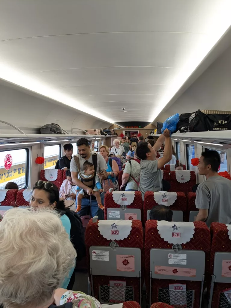 Heute werden wir Vientiane wieder verlassen und mit einem modernen Schnellzug nach Luang Prabang fahren. Die Sicherheitsbestimmungen für den Zug sind wie an einem Flughafen sehr streng. Man darf keine scharfen oder leicht entzündliche Gegenstände im Gepäck mit sich führen. Da man den Koffer mit in den Wagon nimmt, darf auch hier nichts Gefährliches eingepackt sein. Da wir dies beim Kofferpacken schon wussten, haben wir kein Taschenmesser und auch keine supergute Nagelschere eingesteckt. Heute früh wurden diese Gegenstände von der Reiseleitung eingefordert, in einen Karton gepackt und gesondert transportiert.